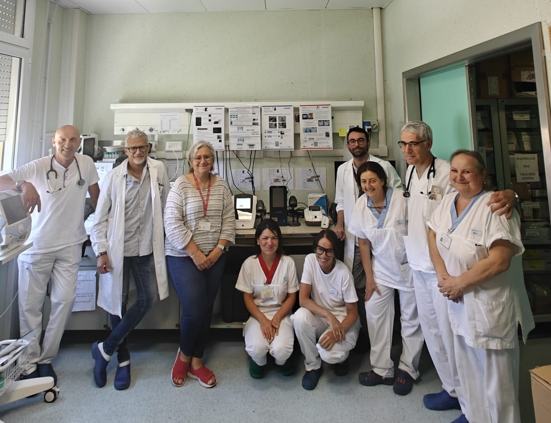 In foto la dottoressa Colla e il dottor Romano con le equipe di Pronto Soccorso nell’immagine sopra e di Terapia Intensiva e Cardiologia nell’immagine sotto