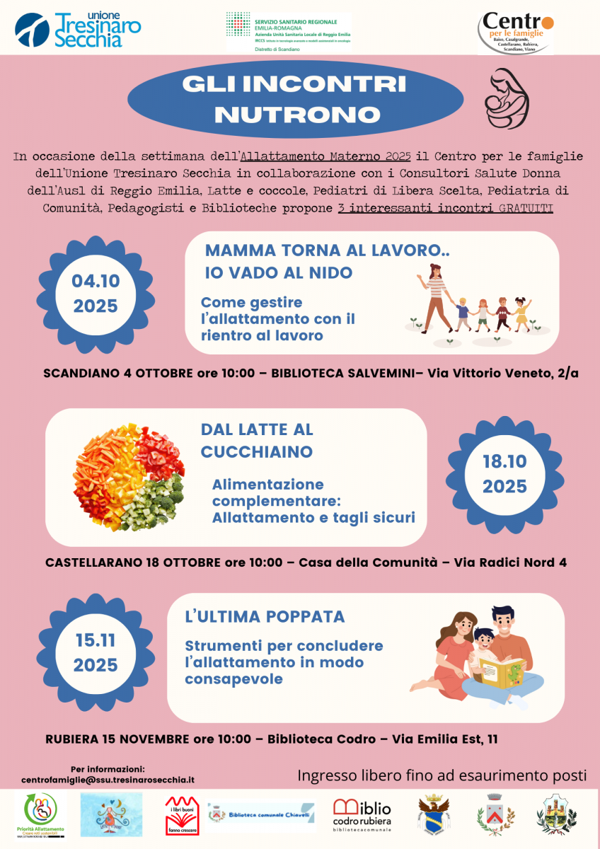 In occasione della Settimana dell'Allattamento Materno 2025 il Centro per le Famiglie dell'Unione Tresinaro Secchia in collaborazione con i Consultori Salute Donna dell'AUSL IRCCS di Reggio Emilia, Latte e Coccole, Pediatri di Libera Scelta, Pediatri di Comunità, Pedagogisti e Biblioteche propone tre incontri GRATUITI